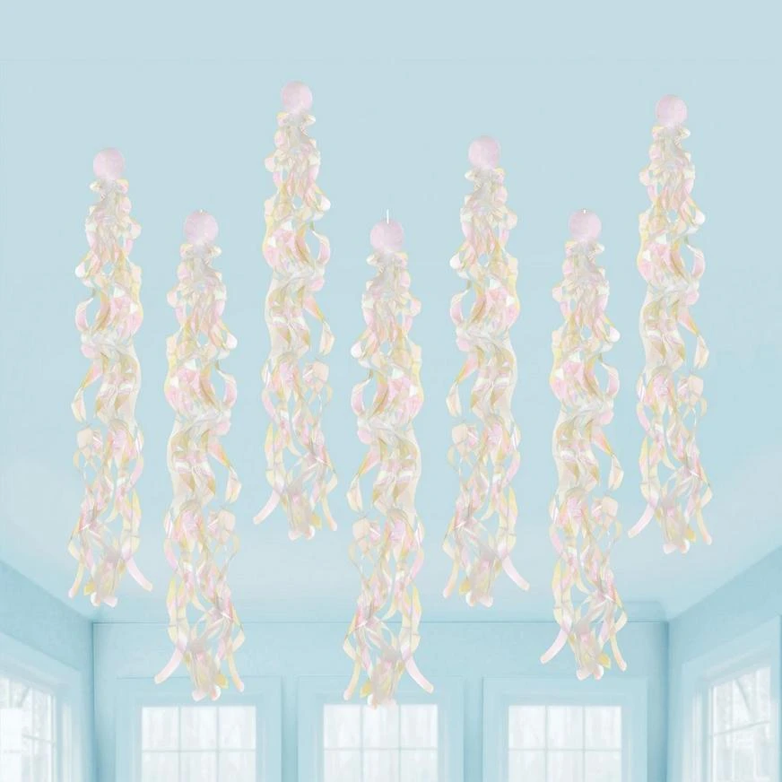 Eye-catching hanging swirls are the perfect finishing touch to your party room! Strips of iridescent fabric cascade down in spirals to create a soft and whimsical effect. Attached plastic hooks make them easy to hang.