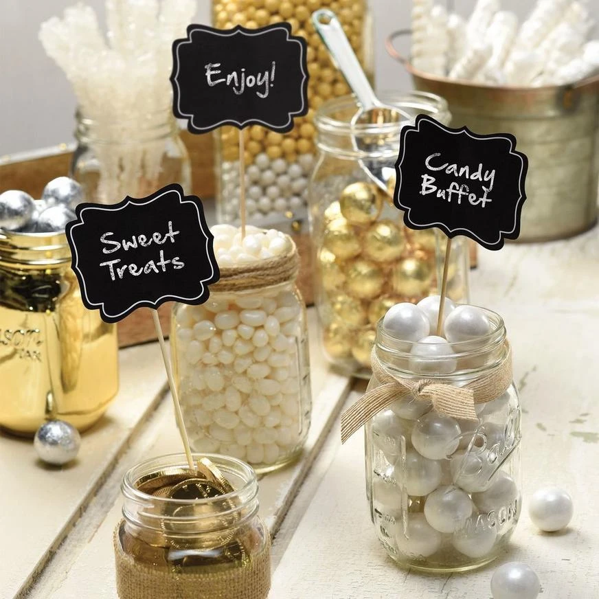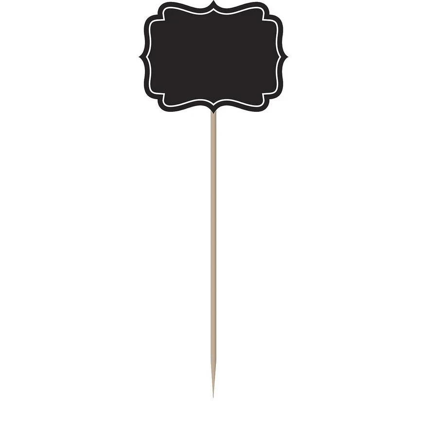 Use Large Chalkboard Party Picks to add a big statement to your black tie event! These paper picks feature pieces of black cardstock that are decorated with a scrollwork design around the border. Each card is attached to a tall wood stick, making them perfect to display in buffet foods. With plenty of blank space in the middle of each party pick, you can write guests’ names, the names of dishes, or sweet messages to celebrate your special event.