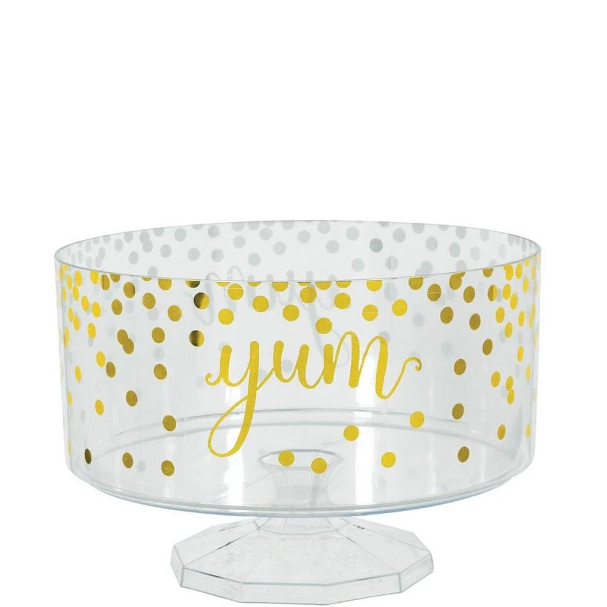 Guests will say “Yum!” when they see treats displayed on this Large Metallic Gold Polka Dots Plastic Trifle Container! This party dish features a clear plastic cylinder with elegant metallic gold polka dot print and a “Yum” headline and sits atop a faceted stand. This chic trifle container makes an elegant and easy-to-use addition to your gold candy buffet display. Perfect for baby and bridal showers, weddings, birthdays, and any other celebration, the clear and gold plastic candy dish can be filled with lollipops, gumballs, jelly beans, or any other tasty treat you can think of!