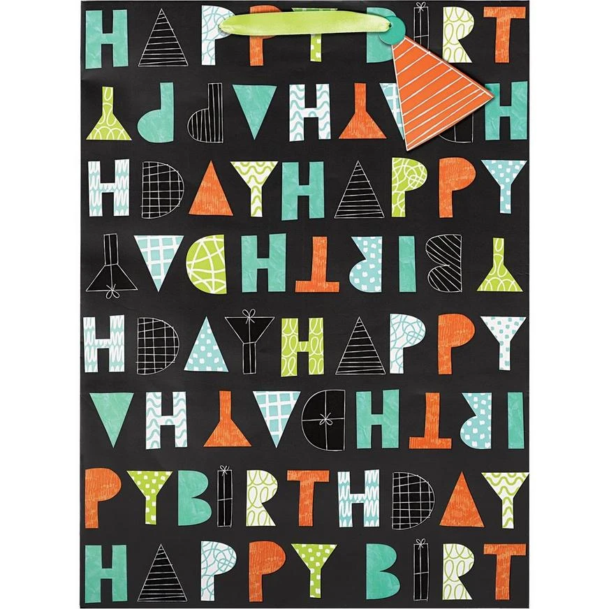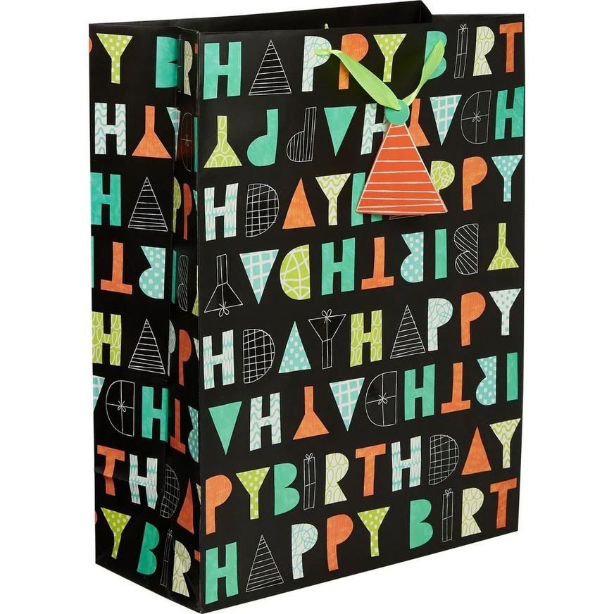 Wish them the happiest of birthdays with this Large Paper Patterned Letter Birthday Gift Bag! The large black paper gift bag features the repeating headline “Happy Birthday” in striped, swirled, dotted, and grid patterns. Its green ribbon handle has an orange party hat-shaped gift tag attached so you can write a message for the guest of honor. Put clothes, large toys, and other birthday presents in this gift bag and it’s instantly ready for giving!