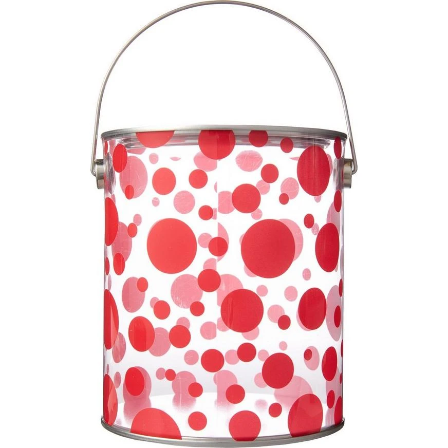 So whimsical, the Large Red Polka Dot Plastic Favor Paint Can is a unique way to treat your guests! The clear plastic pail with a polka dot pattern has a secure lid and comes with a small metal disc attached to make opening easy. Fill with layers of wrapped candies, treats, trinkets, and favors. Tie festive ribbons or attach balloons to the handles for a cute centerpiece. You can’t put a lid on the possibilities or on the fun. Guests will walk away from your party swinging their pails and remembering their amazing day!