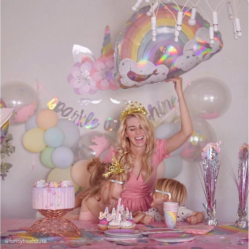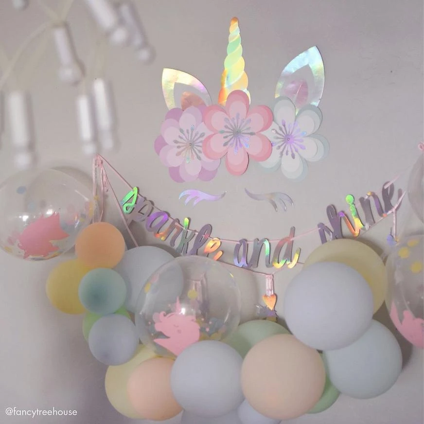 Create the ultimate unicorn dream setting for your little one’s birthday with Magical Rainbow Unicorn Floral Cutouts! The decorating kit includes cutouts of a unicorn horn and ears in an iridescent finish for a pop of shine. Just below sit pastel cardstock flowers with layered petals for a 3D effect. Attach these party decorations on the wall using double-sided tape or Sticky Tack (sold separately) or use them as part of a photo booth backdrop at your child’s unicorn birthday party!