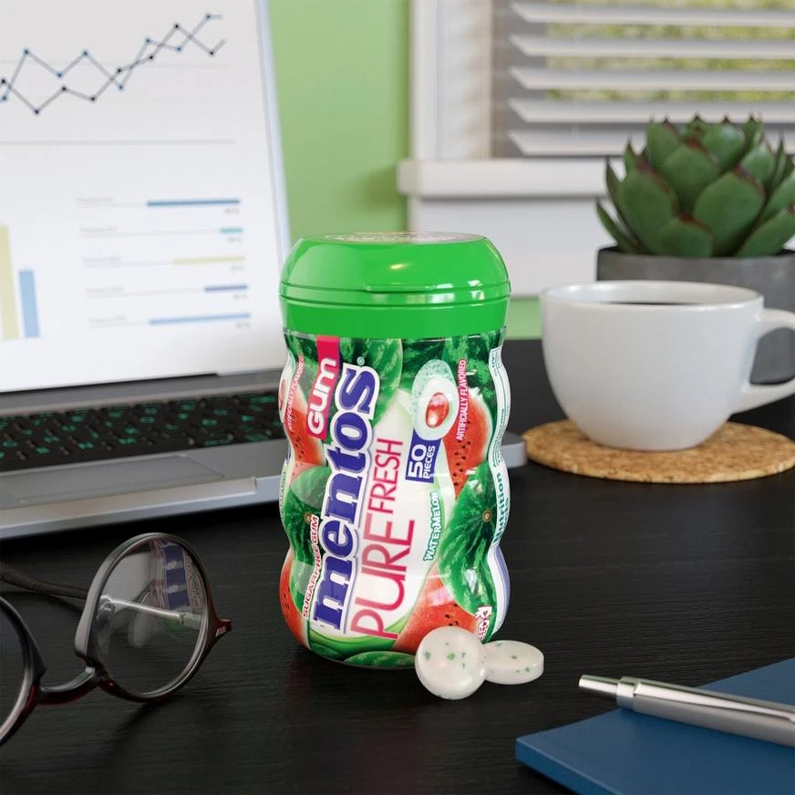 Have a fresh day with Mentos Pure Fresh Watermelon Chewing Gum! Each piece of this watermelon-flavored gum gives you a blast of fresh fruit flavor that lasts chew after chew. Chewing gum with xylitol may reduce the risk of tooth decay, and Mentos Pure Fresh chewing gum contains more xylitol than the leading sugar-free chewing gum brand. The Mentos curvy bottle is perfect to keep at your desk, in your car, at home, or anywhere you may want some freshness! With 50 pieces per bottle, make fresh connections by sharing or keep all the freshness to yourself.