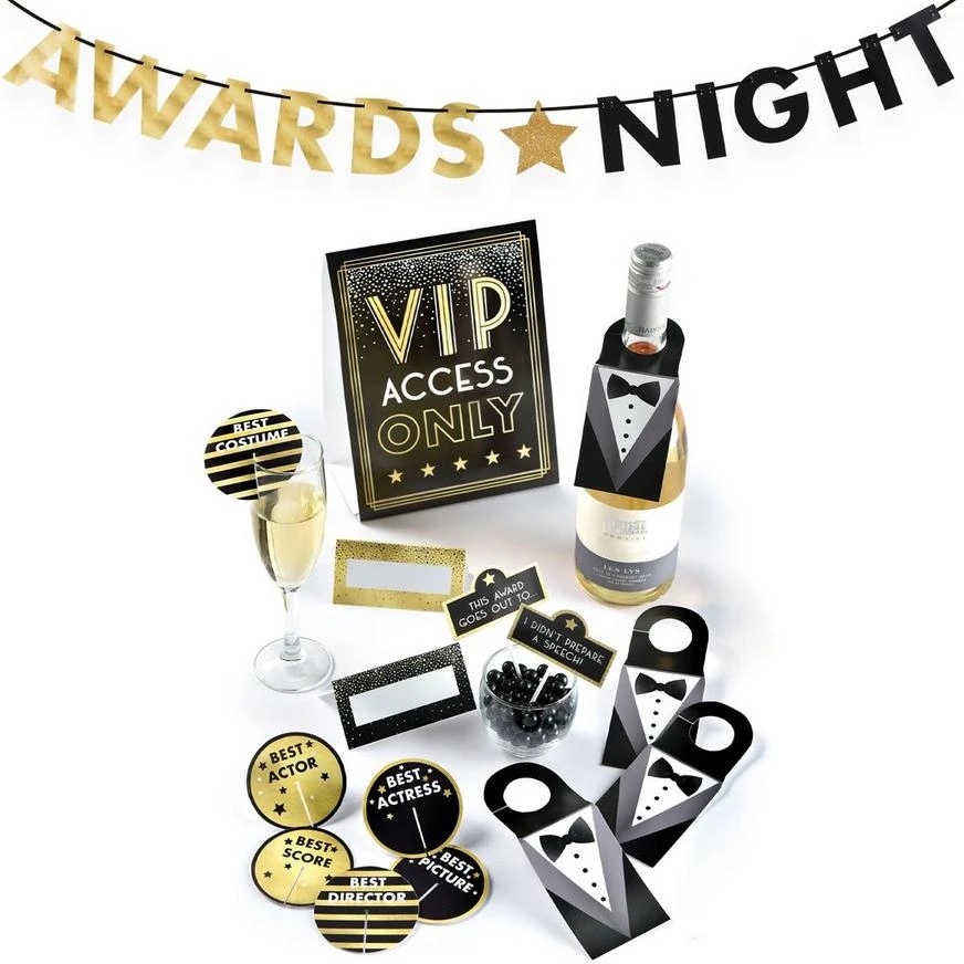 This 18-piece decorating kit contains everything you need to get guests in the spirit, including an “Awards Night” banner, superlative drink markers, tuxedo bottle tags, and tent cards to label snacks.