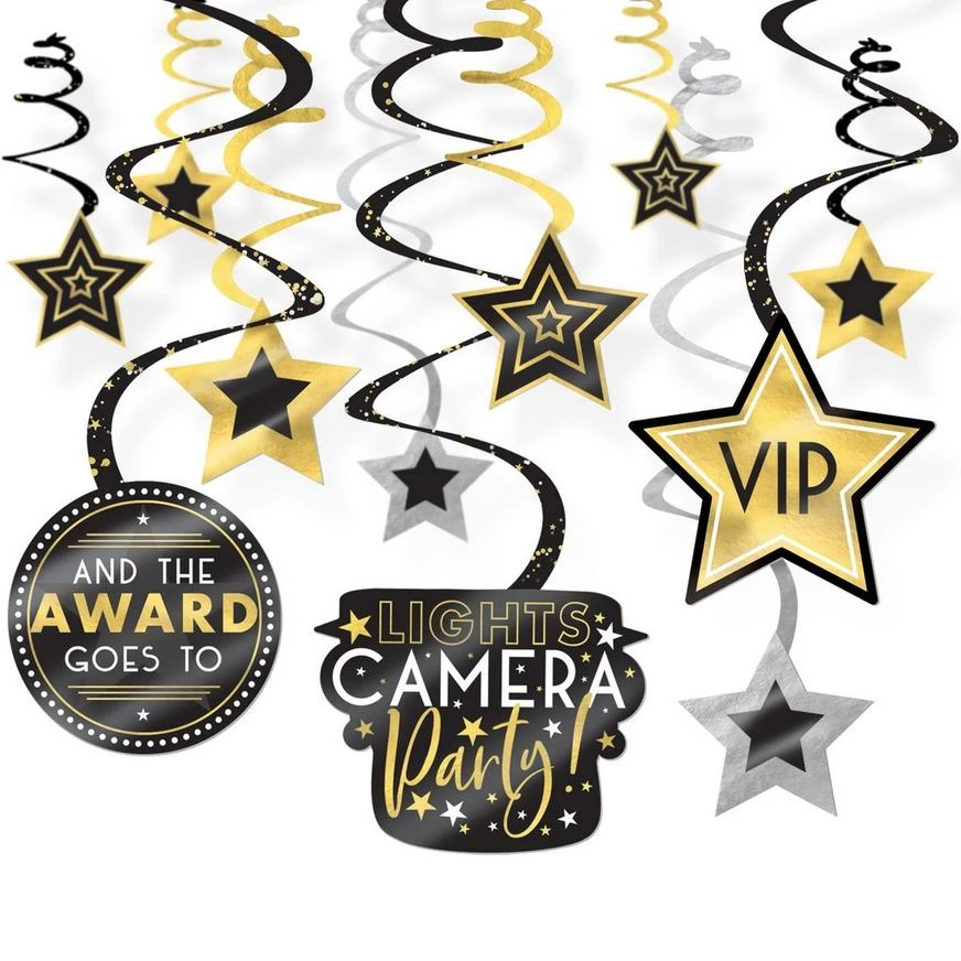 Add some glitz and glam to your awards night-themed party with these swirl decorations! The black, silver, and gold hanging spirals feature cutouts of stars and phrases like “Lights, Camera, Party,” “VIP,” and “And The Award Goes To.”