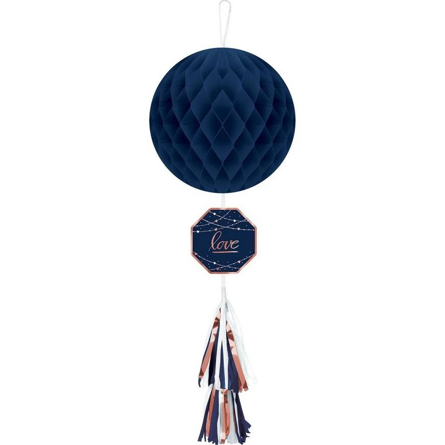 Decorate your navy-themed wedding festivities with the Navy Love Honeycomb Decoration with Tail! This large sphere-shaped decoration in navy and features a navy hexagon cutout with a metallic rose gold that has a metallic rose gold “Love” headline with a string decoration image around the text and an attached fringe tassel tail. Simply unfold the honeycomb paper ball to create the 3D effect, then fluff up the tail for an elegant look. Display the Navy Love Honeycomb Decoration with Tail at anniversary dinners, bridal showers, engagement parties, or wedding receptions!