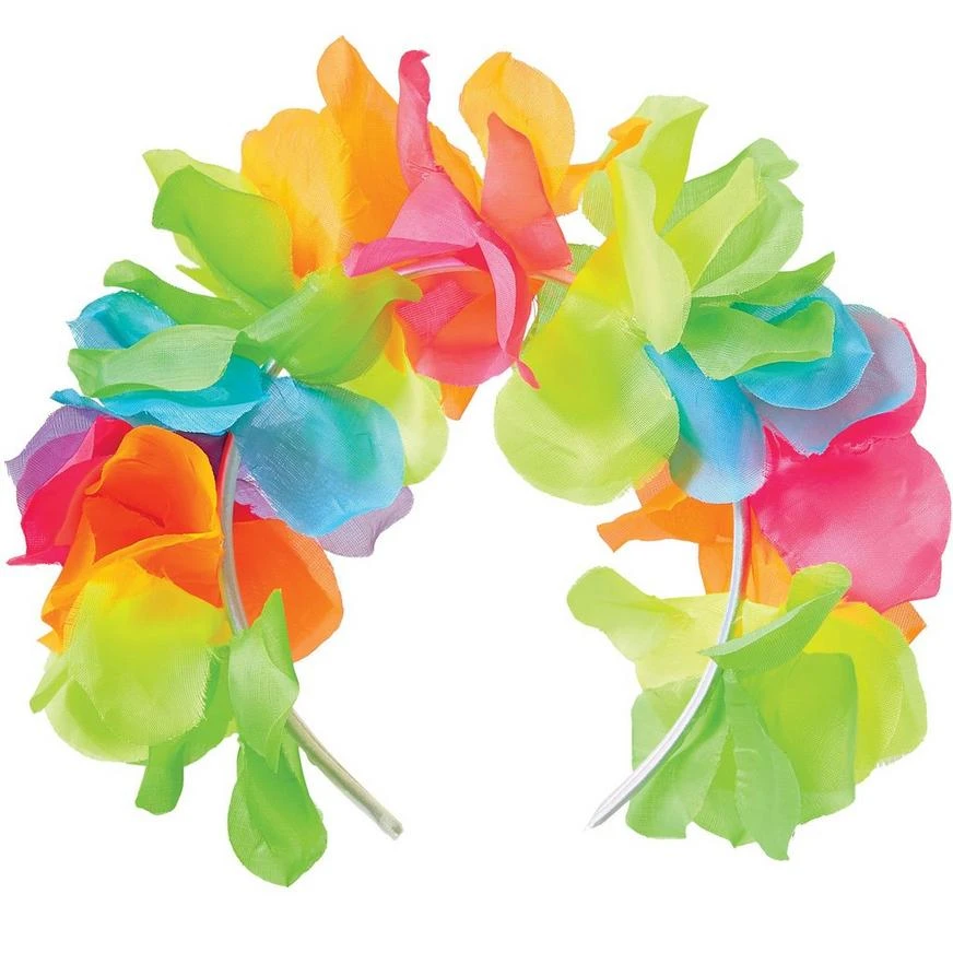 This fabric floral headband features a row of neon flowers along a white, fabric-covered plastic headband. It’s the perfect accessory for your next summer party or tropical-inspired celebration.