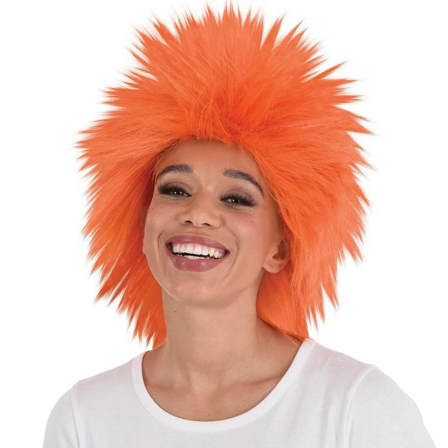 Our Orange Crazy Wig shows how crazy you are for your team! This orange wig has short faux hair that sticks up every which way. A fun way for men, women, and children to show support for their team or school, this crazy hair wig can be paired with a wig cap (sold separately) for a flawless look.