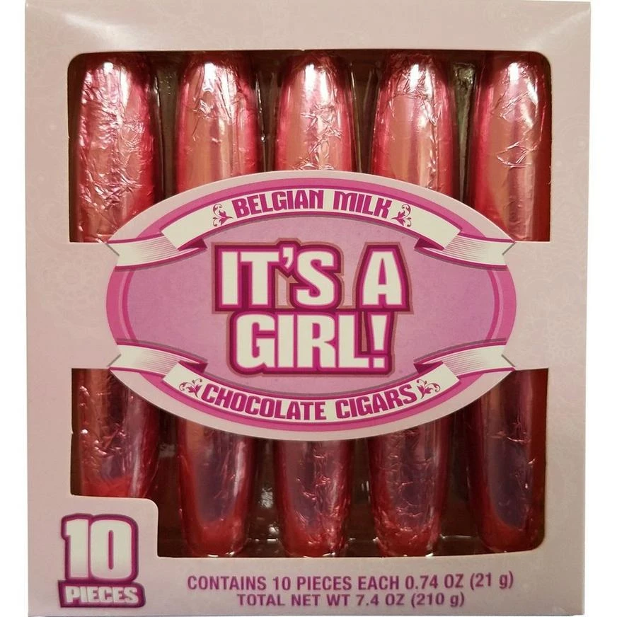 Hooray, it’s a girl! Pass out these Pink It’s a Girl Belgian Milk Chocolate Cigars so everyone can share in the celebration. The belgian chocolate candies arrive individually wrapped in pink foil and shaped like a cigar.