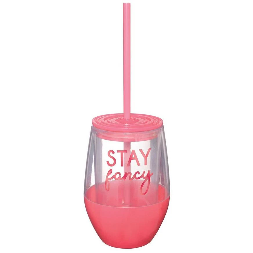 Pink Stay Fancy Plastic Stemless Wine Glass with Straw product details: