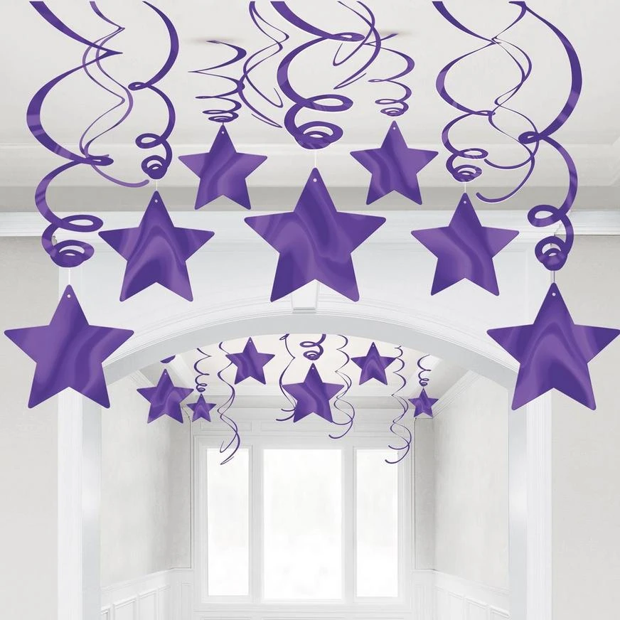 Throw a star-studded event by decorating with Purple Star Swirl Decorations. Attached to each shining swirl is a matching die-cut star that flutters in the wind. These shimmering ceiling decorations have attached plastic hooks for easy display and removal, and can even be stored and reused for future celebrations.