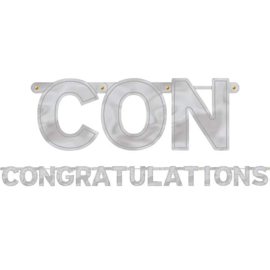 Congratulate the happy couple with a Silver Congratulations Letter Banner! This cardstock letter banner features large, jointed letters that read “Congratulations,” are covered in metallic silver, and are connected for easy display. Hang up a banner in a doorway, above the food table, or along a mantel. The wedding banner adds a perfect touch of shimmery cheer to a bridal shower, engagement party, or celebratory event.