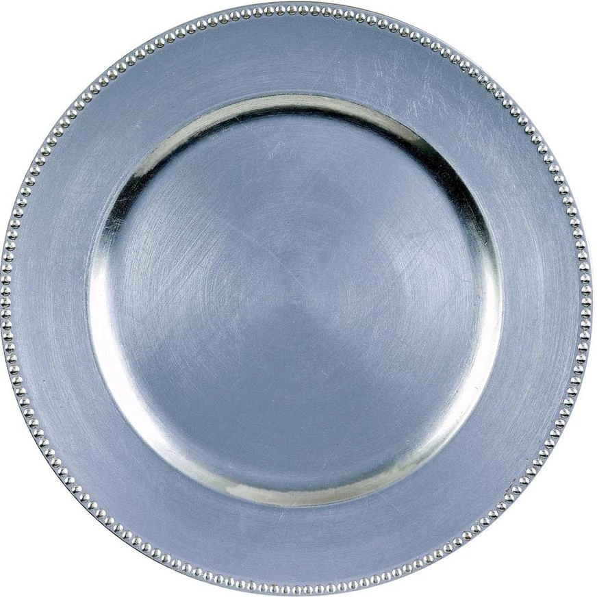 Silver Premium Plastic Chargers are a quick and easy way to dress up your place settings. They feature a silver sheen and an elegant dotted border, bringing a luxe look to any table.