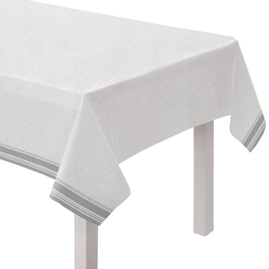 This sleek and elegant table cover comes in a crisp white with a striped silver border. Its premium paper construction provides the look and feel of linen without the hefty price tag.