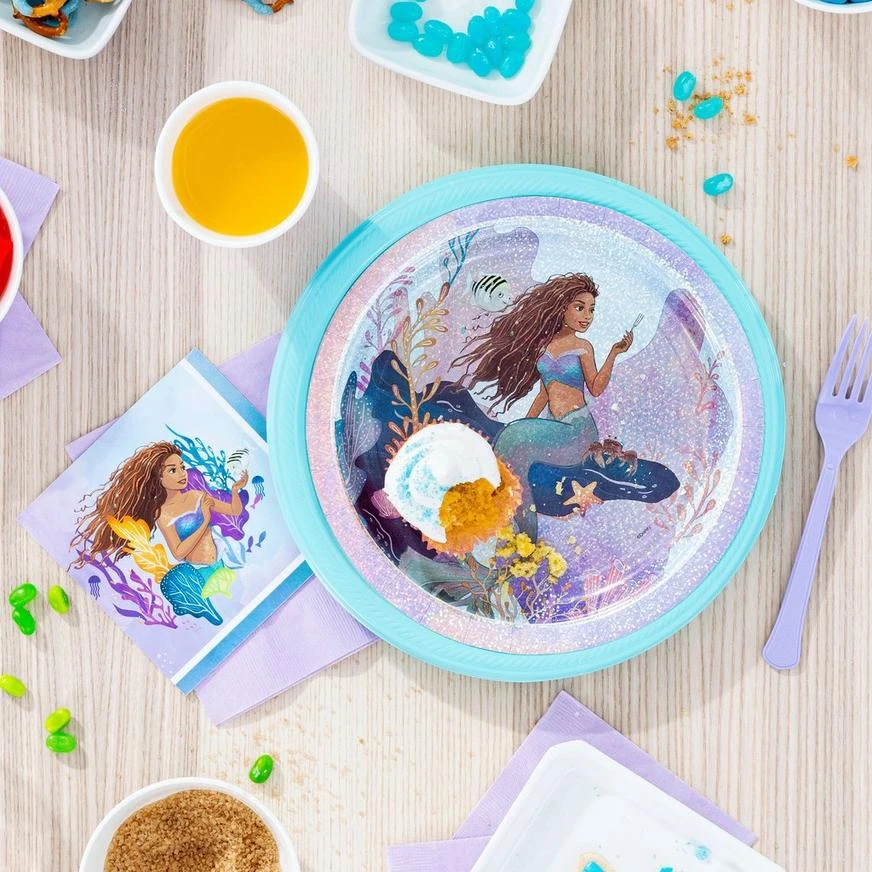 These small, two-ply paper napkins feature a watercolor under-the-sea scene with Ariel, Flounder, and Sebastian. In addition to cleaning up spills, they’re great for creating a themed tablescape at any Little Mermaid birthday or watch party.