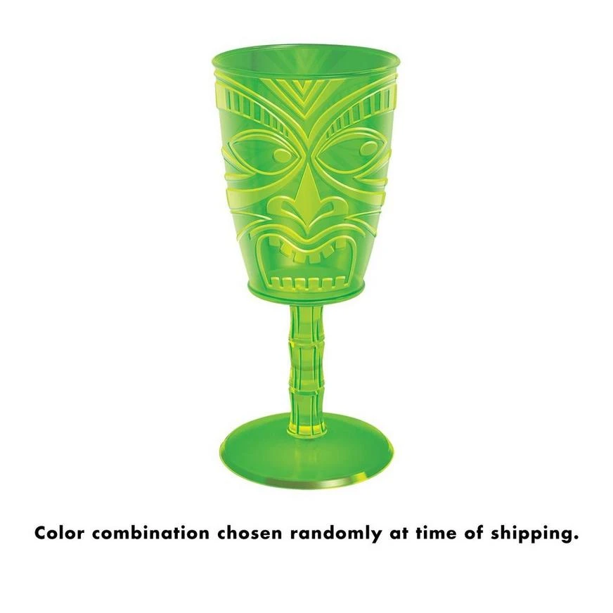 Raise your glass in true isle style with a Tiki Plastic Wine Glass. Made of durable plastic, it features a tiki mask and a bamboo-shaped stem. The cup comes in blue or green and the color you receive is a surprise. Perfect for luaus, pool parties, and other tropical-themed occasions.