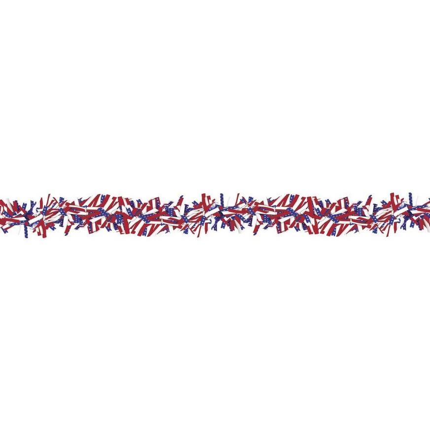 Let your American pride brighten up the party with a Tinsel Patriotic Garland! This decoration features strands of red, white, and blue tinsel, complete with white stars on the blue strands. Add shine to any party from sea to shining sea with a shiny garland!