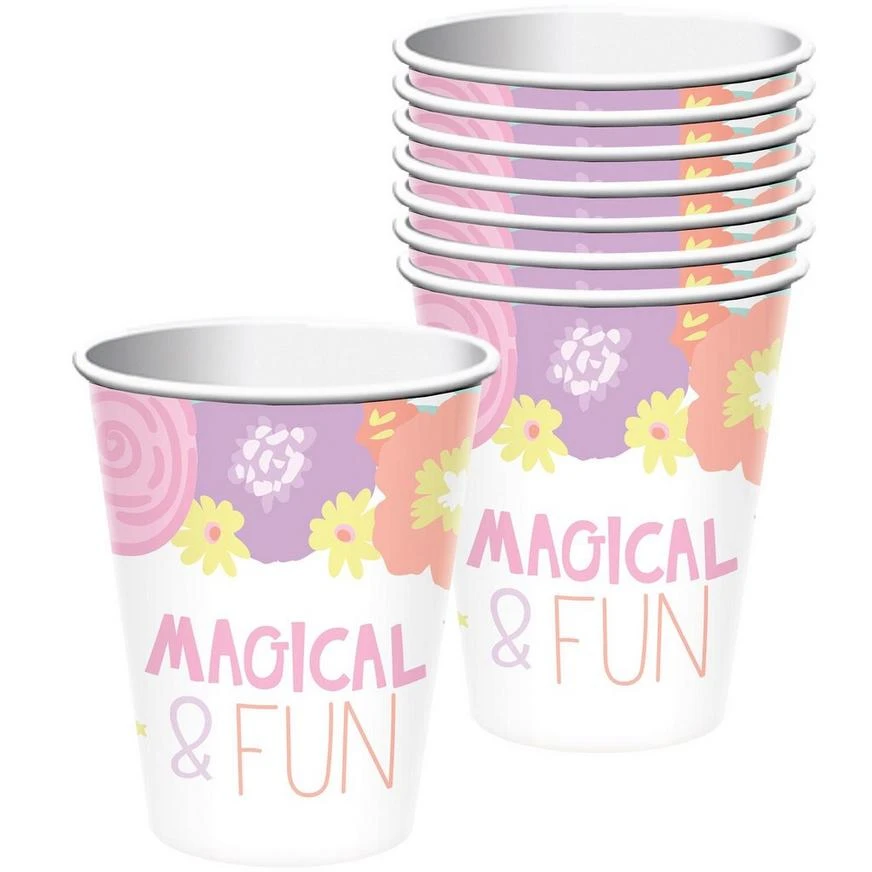 Complete your little one’s birthday party tableware with the Unicorn Party Cups! These paper cups feature a multicolor “Magical & Fun” headline with a colorful floral print wraparound design. Fill these cute cups with delicious cold or hot beverages for your child and their friends! The Unicorn Party Cups can also be used to hold candy, crafts, snacks, and more!