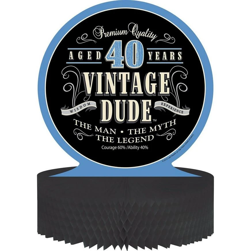 He’s a man with exquisite taste — and this Vintage Dude 40th Birthday Honeycomb Centerpiece suits his sophisticated style! This table centerpiece features a black tissue paper base that fans out in a honeycomb pattern. An attached round cardstock cutout has “Vintage Dude” printed in ivory letters against solid black on both sides. Other praises for the well-seasoned man read “The man, the myth, the legend” and “Aged 40 years” inside a blue border. Use this Vintage Dude 40th Birthday Honeycomb Centerpiece to decorate a 40th birthday party!
