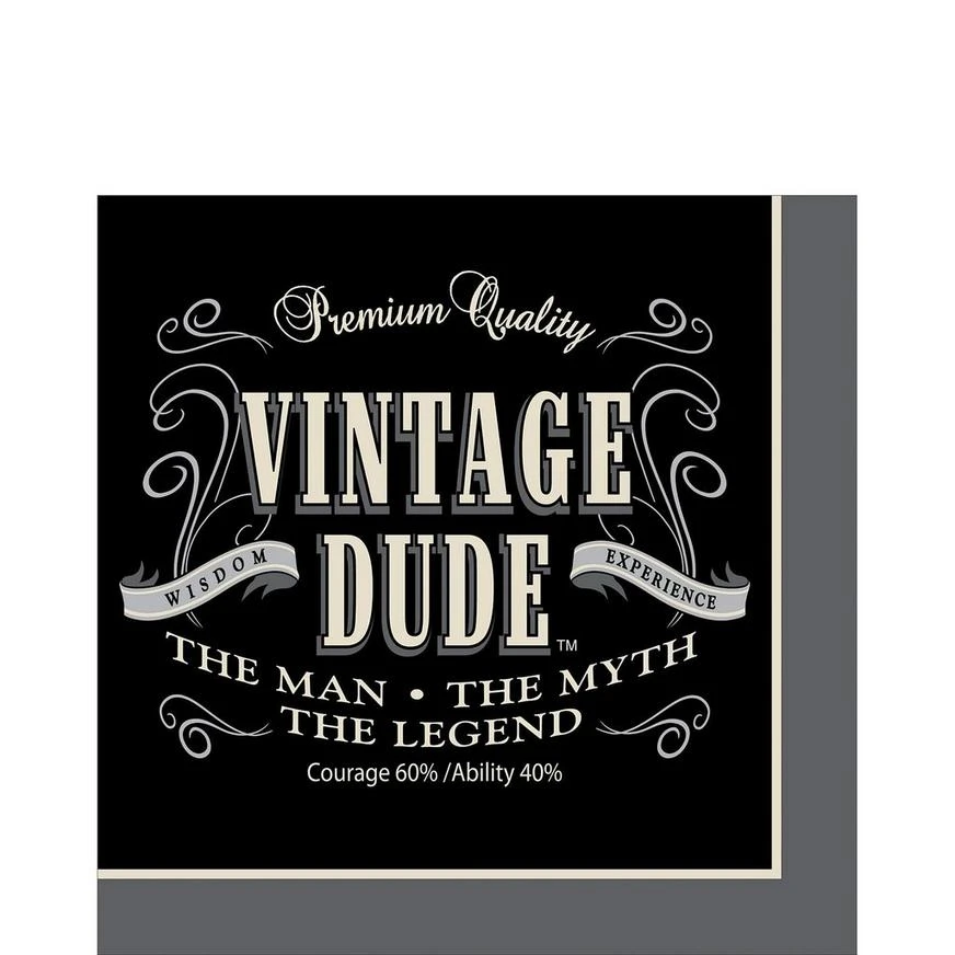 The man of the hour is aged to perfection, so celebrate with Vintage Dude Lunch Napkins! These printed paper napkins feature the manly phrase “Vintage Dude” in ivory letters against a black background. A sleek gray border lends an extra masculine touch to these two-ply folded napkins, which also feature words of praise for the well-seasoned man like “The man, the myth, the legend” and “Premium Quality.” Shop these Vintage Dude Lunch Napkins, because he deserves nothing but the best!