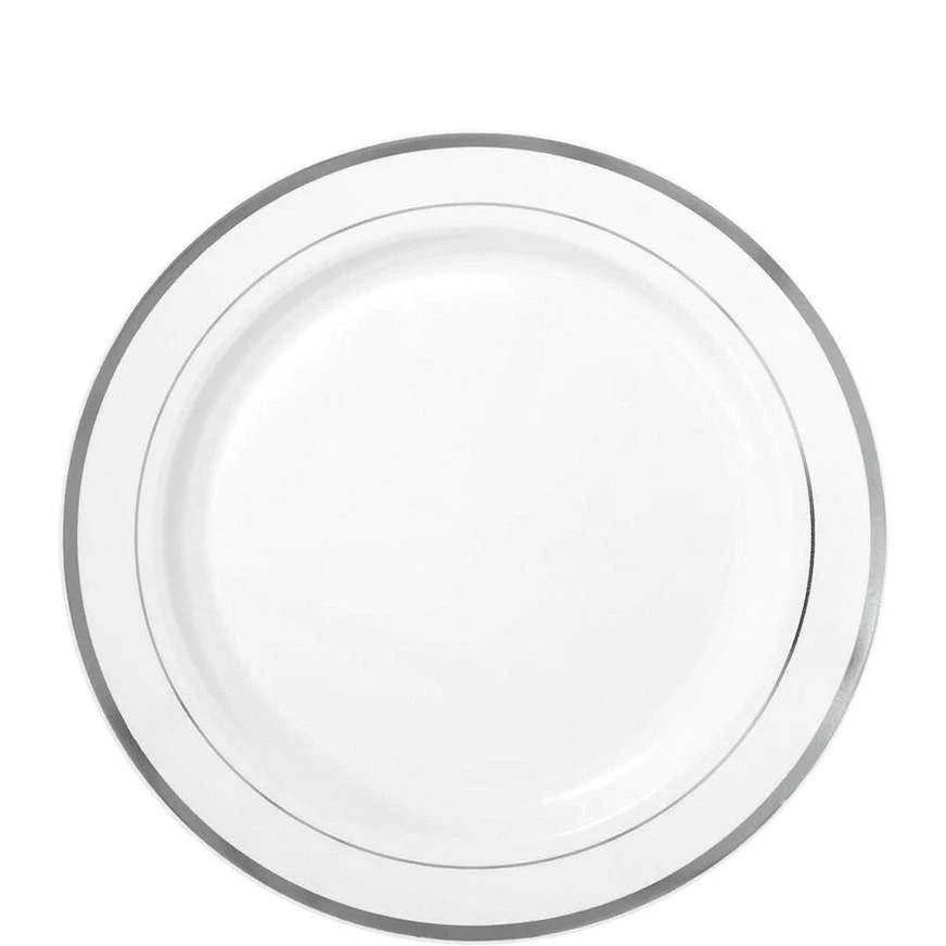 Step up your table service with White Silver-Trimmed Premium Plastic Lunch Plates. A classic addition to any party, these heavy-duty plastic plates feature an elegant metallic silver border. With the look of fine china and the convenience of plastic, the white and silver plates are a party staple. Use them for a variety of occasions, including luncheons, birthdays, and weddings.