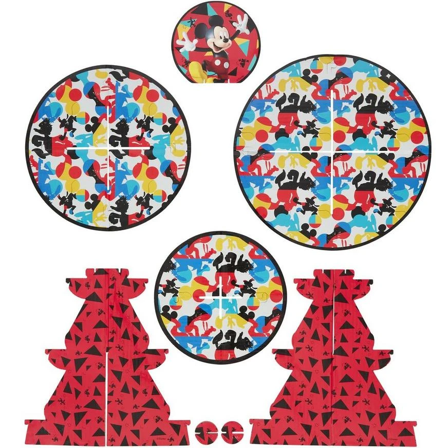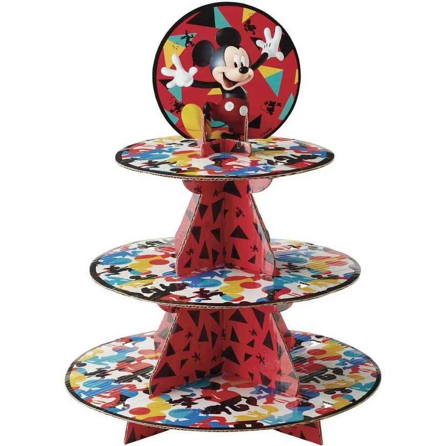 The cutest way to display the delicious cupcakes at your little one’s Disney birthday party! This cardstock cupcake stand is red and black and features Mickey with colorful silhouettes and shapes. Plus, the three-tier display is simple to assemble.