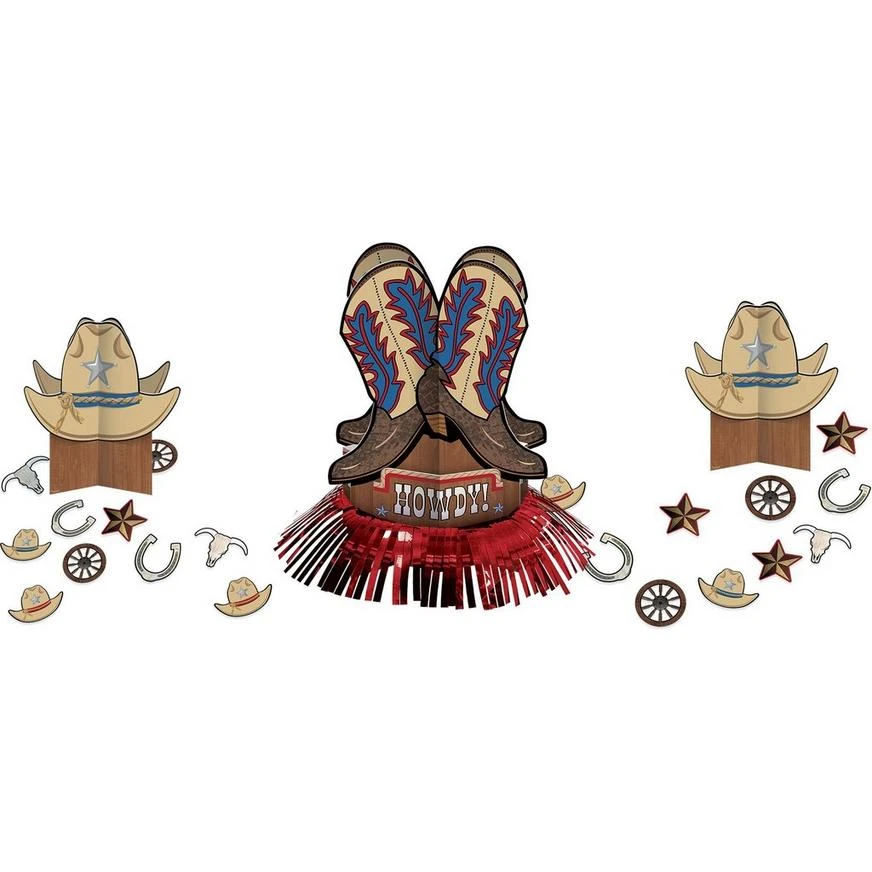 Add a touch of country to your buffet table! The Yeehaw Western Table Decorating Kit features small cowboy hat centerpieces in light brown. The largest centerpiece features stylish cowboy boots atop a “Howdy!” sign and is accented by flashy red foil fringe around the base. Table scatter shaped like wagon wheels, horseshoes, and cowboy hats make it the perfect addition to your country party or any western-themed event.